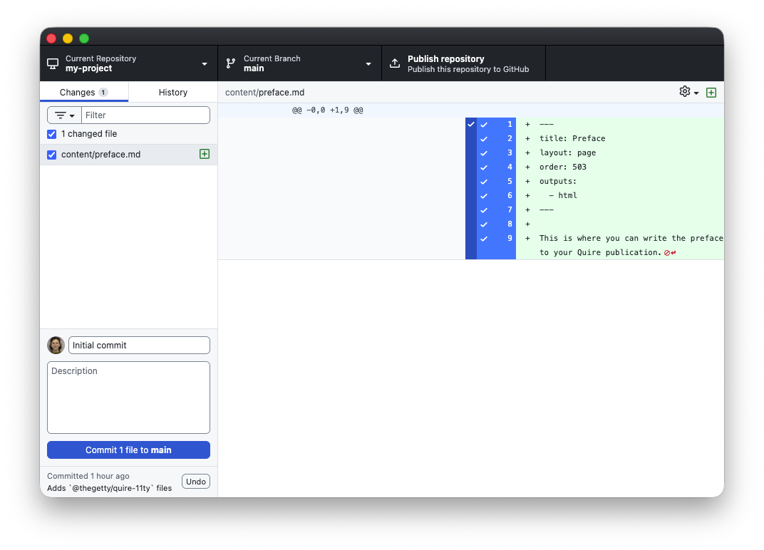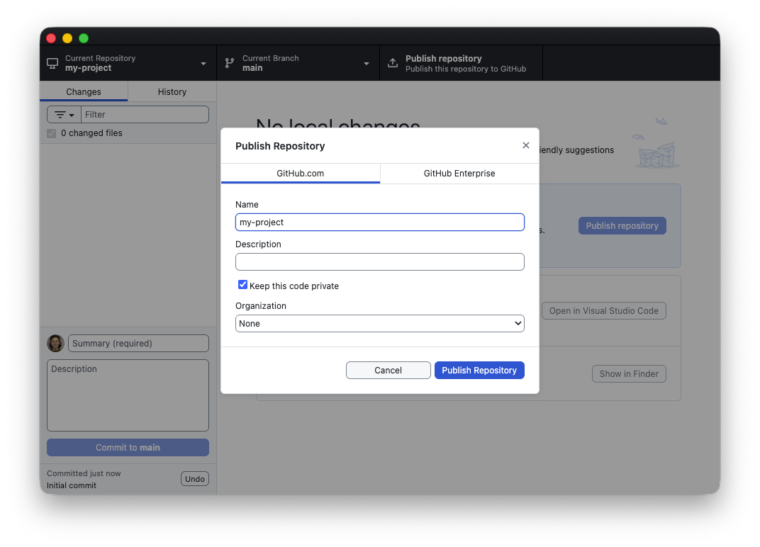 3. If there are any items listed in the window’s left-hand pane, you will need to commit them to your project. As this will be your first commit, type “Initial commit” in the Summary field and click the “Commit to main” button.